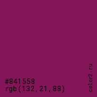 Цвет #841558 в цветовой модели RGB обозначается тремя октетами (132, 21, 88) в десятичном формате и #841558 в шестнадцатиричном (hex) формате, которые являются интенсивностью красного 132 (hex 84), интенсивность зелёного 21 (hex 15) и интенсивность синего 88 (hex 58).