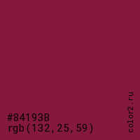 Цвет #84193B в цветовой модели RGB обозначается тремя октетами (132, 25, 59) в десятичном формате и #84193B в шестнадцатиричном (hex) формате, которые являются интенсивностью красного 132 (hex 84), интенсивность зелёного 25 (hex 19) и интенсивность синего 59 (hex 3B).