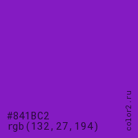Цвет #841BC2 в цветовой модели RGB обозначается тремя октетами (132, 27, 194) в десятичном формате и #841BC2 в шестнадцатиричном (hex) формате, которые являются интенсивностью красного 132 (hex 84), интенсивность зелёного 27 (hex 1B) и интенсивность синего 194 (hex C2).