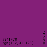 Цвет #841F78 в цветовой модели RGB обозначается тремя октетами (132, 31, 120) в десятичном формате и #841F78 в шестнадцатиричном (hex) формате, которые являются интенсивностью красного 132 (hex 84), интенсивность зелёного 31 (hex 1F) и интенсивность синего 120 (hex 78).