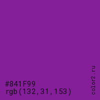Цвет #841F99 в цветовой модели RGB обозначается тремя октетами (132, 31, 153) в десятичном формате и #841F99 в шестнадцатиричном (hex) формате, которые являются интенсивностью красного 132 (hex 84), интенсивность зелёного 31 (hex 1F) и интенсивность синего 153 (hex 99).