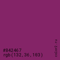 Цвет #842467 в цветовой модели RGB обозначается тремя октетами (132, 36, 103) в десятичном формате и #842467 в шестнадцатиричном (hex) формате, которые являются интенсивностью красного 132 (hex 84), интенсивность зелёного 36 (hex 24) и интенсивность синего 103 (hex 67).