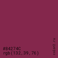 Цвет #84274C в цветовой модели RGB обозначается тремя октетами (132, 39, 76) в десятичном формате и #84274C в шестнадцатиричном (hex) формате, которые являются интенсивностью красного 132 (hex 84), интенсивность зелёного 39 (hex 27) и интенсивность синего 76 (hex 4C).