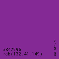 Цвет #842995 в цветовой модели RGB обозначается тремя октетами (132, 41, 149) в десятичном формате и #842995 в шестнадцатиричном (hex) формате, которые являются интенсивностью красного 132 (hex 84), интенсивность зелёного 41 (hex 29) и интенсивность синего 149 (hex 95).