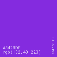 Цвет #842BDF в цветовой модели RGB обозначается тремя октетами (132, 43, 223) в десятичном формате и #842BDF в шестнадцатиричном (hex) формате, которые являются интенсивностью красного 132 (hex 84), интенсивность зелёного 43 (hex 2B) и интенсивность синего 223 (hex DF).