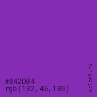 Цвет #842DB4 в цветовой модели RGB обозначается тремя октетами (132, 45, 180) в десятичном формате и #842DB4 в шестнадцатиричном (hex) формате, которые являются интенсивностью красного 132 (hex 84), интенсивность зелёного 45 (hex 2D) и интенсивность синего 180 (hex B4).