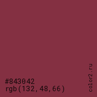 Цвет #843042 в цветовой модели RGB обозначается тремя октетами (132, 48, 66) в десятичном формате и #843042 в шестнадцатиричном (hex) формате, которые являются интенсивностью красного 132 (hex 84), интенсивность зелёного 48 (hex 30) и интенсивность синего 66 (hex 42).
