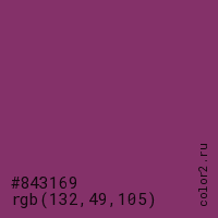 Цвет #843169 в цветовой модели RGB обозначается тремя октетами (132, 49, 105) в десятичном формате и #843169 в шестнадцатиричном (hex) формате, которые являются интенсивностью красного 132 (hex 84), интенсивность зелёного 49 (hex 31) и интенсивность синего 105 (hex 69).