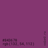 Цвет #843670 в цветовой модели RGB обозначается тремя октетами (132, 54, 112) в десятичном формате и #843670 в шестнадцатиричном (hex) формате, которые являются интенсивностью красного 132 (hex 84), интенсивность зелёного 54 (hex 36) и интенсивность синего 112 (hex 70).