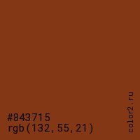Цвет #843715 в цветовой модели RGB обозначается тремя октетами (132, 55, 21) в десятичном формате и #843715 в шестнадцатиричном (hex) формате, которые являются интенсивностью красного 132 (hex 84), интенсивность зелёного 55 (hex 37) и интенсивность синего 21 (hex 15).