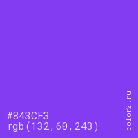 Цвет #843CF3 в цветовой модели RGB обозначается тремя октетами (132, 60, 243) в десятичном формате и #843CF3 в шестнадцатиричном (hex) формате, которые являются интенсивностью красного 132 (hex 84), интенсивность зелёного 60 (hex 3C) и интенсивность синего 243 (hex F3).