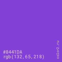 Цвет #8441DA в цветовой модели RGB обозначается тремя октетами (132, 65, 218) в десятичном формате и #8441DA в шестнадцатиричном (hex) формате, которые являются интенсивностью красного 132 (hex 84), интенсивность зелёного 65 (hex 41) и интенсивность синего 218 (hex DA).