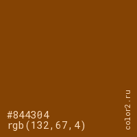 Цвет #844304 в цветовой модели RGB обозначается тремя октетами (132, 67, 4) в десятичном формате и #844304 в шестнадцатиричном (hex) формате, которые являются интенсивностью красного 132 (hex 84), интенсивность зелёного 67 (hex 43) и интенсивность синего 4 (hex 04).