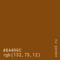 Цвет #84490C в цветовой модели RGB обозначается тремя октетами (132, 73, 12) в десятичном формате и #84490C в шестнадцатиричном (hex) формате, которые являются интенсивностью красного 132 (hex 84), интенсивность зелёного 73 (hex 49) и интенсивность синего 12 (hex 0C).