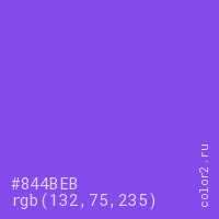 Цвет #844BEB в цветовой модели RGB обозначается тремя октетами (132, 75, 235) в десятичном формате и #844BEB в шестнадцатиричном (hex) формате, которые являются интенсивностью красного 132 (hex 84), интенсивность зелёного 75 (hex 4B) и интенсивность синего 235 (hex EB).