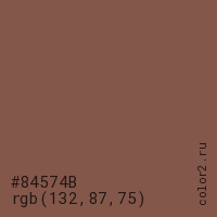 Цвет #84574B в цветовой модели RGB обозначается тремя октетами (132, 87, 75) в десятичном формате и #84574B в шестнадцатиричном (hex) формате, которые являются интенсивностью красного 132 (hex 84), интенсивность зелёного 87 (hex 57) и интенсивность синего 75 (hex 4B).