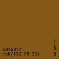 Цвет #845817 в цветовой модели RGB обозначается тремя октетами (132, 88, 23) в десятичном формате и #845817 в шестнадцатиричном (hex) формате, которые являются интенсивностью красного 132 (hex 84), интенсивность зелёного 88 (hex 58) и интенсивность синего 23 (hex 17).