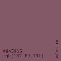 Цвет #845965 в цветовой модели RGB обозначается тремя октетами (132, 89, 101) в десятичном формате и #845965 в шестнадцатиричном (hex) формате, которые являются интенсивностью красного 132 (hex 84), интенсивность зелёного 89 (hex 59) и интенсивность синего 101 (hex 65).