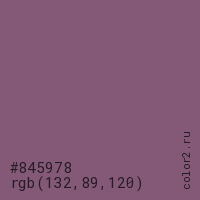 Цвет #845978 в цветовой модели RGB обозначается тремя октетами (132, 89, 120) в десятичном формате и #845978 в шестнадцатиричном (hex) формате, которые являются интенсивностью красного 132 (hex 84), интенсивность зелёного 89 (hex 59) и интенсивность синего 120 (hex 78).