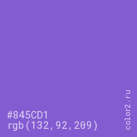 Цвет #845CD1 в цветовой модели RGB обозначается тремя октетами (132, 92, 209) в десятичном формате и #845CD1 в шестнадцатиричном (hex) формате, которые являются интенсивностью красного 132 (hex 84), интенсивность зелёного 92 (hex 5C) и интенсивность синего 209 (hex D1).