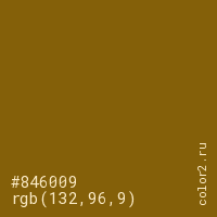 Цвет #846009 в цветовой модели RGB обозначается тремя октетами (132, 96, 9) в десятичном формате и #846009 в шестнадцатиричном (hex) формате, которые являются интенсивностью красного 132 (hex 84), интенсивность зелёного 96 (hex 60) и интенсивность синего 9 (hex 09).