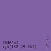 Цвет #8463A4 в цветовой модели RGB обозначается тремя октетами (132, 99, 164) в десятичном формате и #8463A4 в шестнадцатиричном (hex) формате, которые являются интенсивностью красного 132 (hex 84), интенсивность зелёного 99 (hex 63) и интенсивность синего 164 (hex A4).