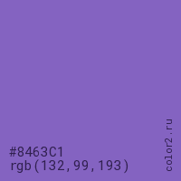 Цвет #8463C1 в цветовой модели RGB обозначается тремя октетами (132, 99, 193) в десятичном формате и #8463C1 в шестнадцатиричном (hex) формате, которые являются интенсивностью красного 132 (hex 84), интенсивность зелёного 99 (hex 63) и интенсивность синего 193 (hex C1).