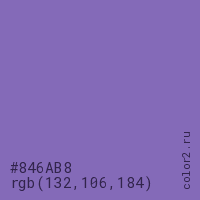 Цвет #846AB8 в цветовой модели RGB обозначается тремя октетами (132, 106, 184) в десятичном формате и #846AB8 в шестнадцатиричном (hex) формате, которые являются интенсивностью красного 132 (hex 84), интенсивность зелёного 106 (hex 6A) и интенсивность синего 184 (hex B8).