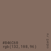 Цвет #846C60 в цветовой модели RGB обозначается тремя октетами (132, 108, 96) в десятичном формате и #846C60 в шестнадцатиричном (hex) формате, которые являются интенсивностью красного 132 (hex 84), интенсивность зелёного 108 (hex 6C) и интенсивность синего 96 (hex 60).