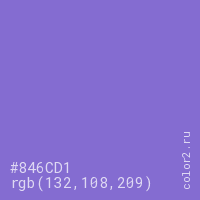 Цвет #846CD1 в цветовой модели RGB обозначается тремя октетами (132, 108, 209) в десятичном формате и #846CD1 в шестнадцатиричном (hex) формате, которые являются интенсивностью красного 132 (hex 84), интенсивность зелёного 108 (hex 6C) и интенсивность синего 209 (hex D1).