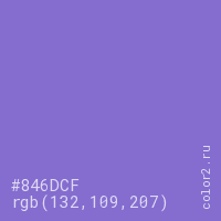 Цвет #846DCF в цветовой модели RGB обозначается тремя октетами (132, 109, 207) в десятичном формате и #846DCF в шестнадцатиричном (hex) формате, которые являются интенсивностью красного 132 (hex 84), интенсивность зелёного 109 (hex 6D) и интенсивность синего 207 (hex CF).