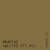 Цвет #846F42 в цветовой модели RGB обозначается тремя октетами (132, 111, 66) в десятичном формате и #846F42 в шестнадцатиричном (hex) формате, которые являются интенсивностью красного 132 (hex 84), интенсивность зелёного 111 (hex 6F) и интенсивность синего 66 (hex 42).