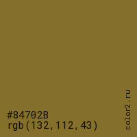 Цвет #84702B в цветовой модели RGB обозначается тремя октетами (132, 112, 43) в десятичном формате и #84702B в шестнадцатиричном (hex) формате, которые являются интенсивностью красного 132 (hex 84), интенсивность зелёного 112 (hex 70) и интенсивность синего 43 (hex 2B).