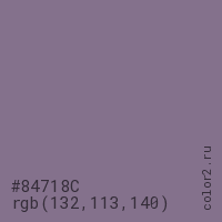 Цвет #84718C в цветовой модели RGB обозначается тремя октетами (132, 113, 140) в десятичном формате и #84718C в шестнадцатиричном (hex) формате, которые являются интенсивностью красного 132 (hex 84), интенсивность зелёного 113 (hex 71) и интенсивность синего 140 (hex 8C).
