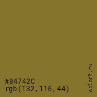 Цвет #84742C в цветовой модели RGB обозначается тремя октетами (132, 116, 44) в десятичном формате и #84742C в шестнадцатиричном (hex) формате, которые являются интенсивностью красного 132 (hex 84), интенсивность зелёного 116 (hex 74) и интенсивность синего 44 (hex 2C).