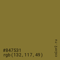 Цвет #847531 в цветовой модели RGB обозначается тремя октетами (132, 117, 49) в десятичном формате и #847531 в шестнадцатиричном (hex) формате, которые являются интенсивностью красного 132 (hex 84), интенсивность зелёного 117 (hex 75) и интенсивность синего 49 (hex 31).