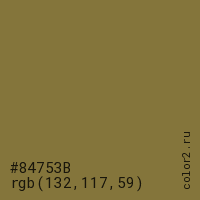 Цвет #84753B в цветовой модели RGB обозначается тремя октетами (132, 117, 59) в десятичном формате и #84753B в шестнадцатиричном (hex) формате, которые являются интенсивностью красного 132 (hex 84), интенсивность зелёного 117 (hex 75) и интенсивность синего 59 (hex 3B).