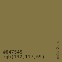 Цвет #847545 в цветовой модели RGB обозначается тремя октетами (132, 117, 69) в десятичном формате и #847545 в шестнадцатиричном (hex) формате, которые являются интенсивностью красного 132 (hex 84), интенсивность зелёного 117 (hex 75) и интенсивность синего 69 (hex 45).