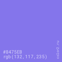 Цвет #8475EB в цветовой модели RGB обозначается тремя октетами (132, 117, 235) в десятичном формате и #8475EB в шестнадцатиричном (hex) формате, которые являются интенсивностью красного 132 (hex 84), интенсивность зелёного 117 (hex 75) и интенсивность синего 235 (hex EB).