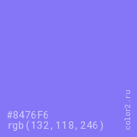Цвет #8476F6 в цветовой модели RGB обозначается тремя октетами (132, 118, 246) в десятичном формате и #8476F6 в шестнадцатиричном (hex) формате, которые являются интенсивностью красного 132 (hex 84), интенсивность зелёного 118 (hex 76) и интенсивность синего 246 (hex F6).