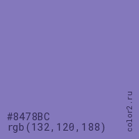 Цвет #8478BC в цветовой модели RGB обозначается тремя октетами (132, 120, 188) в десятичном формате и #8478BC в шестнадцатиричном (hex) формате, которые являются интенсивностью красного 132 (hex 84), интенсивность зелёного 120 (hex 78) и интенсивность синего 188 (hex BC).