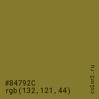 Цвет #84792C в цветовой модели RGB обозначается тремя октетами (132, 121, 44) в десятичном формате и #84792C в шестнадцатиричном (hex) формате, которые являются интенсивностью красного 132 (hex 84), интенсивность зелёного 121 (hex 79) и интенсивность синего 44 (hex 2C).