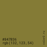 Цвет #847B36 в цветовой модели RGB обозначается тремя октетами (132, 123, 54) в десятичном формате и #847B36 в шестнадцатиричном (hex) формате, которые являются интенсивностью красного 132 (hex 84), интенсивность зелёного 123 (hex 7B) и интенсивность синего 54 (hex 36).