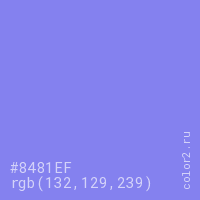 Цвет #8481EF в цветовой модели RGB обозначается тремя октетами (132, 129, 239) в десятичном формате и #8481EF в шестнадцатиричном (hex) формате, которые являются интенсивностью красного 132 (hex 84), интенсивность зелёного 129 (hex 81) и интенсивность синего 239 (hex EF).