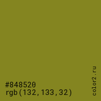 Цвет #848520 в цветовой модели RGB обозначается тремя октетами (132, 133, 32) в десятичном формате и #848520 в шестнадцатиричном (hex) формате, которые являются интенсивностью красного 132 (hex 84), интенсивность зелёного 133 (hex 85) и интенсивность синего 32 (hex 20).