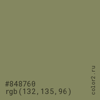 Цвет #848760 в цветовой модели RGB обозначается тремя октетами (132, 135, 96) в десятичном формате и #848760 в шестнадцатиричном (hex) формате, которые являются интенсивностью красного 132 (hex 84), интенсивность зелёного 135 (hex 87) и интенсивность синего 96 (hex 60).