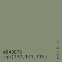 Цвет #848C76 в цветовой модели RGB обозначается тремя октетами (132, 140, 118) в десятичном формате и #848C76 в шестнадцатиричном (hex) формате, которые являются интенсивностью красного 132 (hex 84), интенсивность зелёного 140 (hex 8C) и интенсивность синего 118 (hex 76).