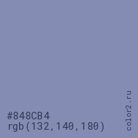 Цвет #848CB4 в цветовой модели RGB обозначается тремя октетами (132, 140, 180) в десятичном формате и #848CB4 в шестнадцатиричном (hex) формате, которые являются интенсивностью красного 132 (hex 84), интенсивность зелёного 140 (hex 8C) и интенсивность синего 180 (hex B4).
