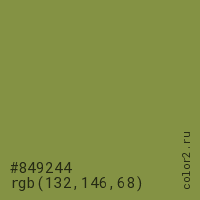 Цвет #849244 в цветовой модели RGB обозначается тремя октетами (132, 146, 68) в десятичном формате и #849244 в шестнадцатиричном (hex) формате, которые являются интенсивностью красного 132 (hex 84), интенсивность зелёного 146 (hex 92) и интенсивность синего 68 (hex 44).