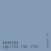 Цвет #849CB3 в цветовой модели RGB обозначается тремя октетами (132, 156, 179) в десятичном формате и #849CB3 в шестнадцатиричном (hex) формате, которые являются интенсивностью красного 132 (hex 84), интенсивность зелёного 156 (hex 9C) и интенсивность синего 179 (hex B3).